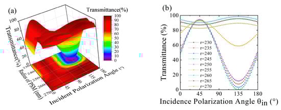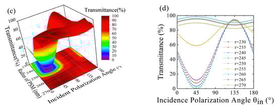 As shown in Figure 4a,c, the change in transmittance is largest when the PSM radius is around 245 nm, which maintains the performance of the polarizer optimized. The transmittances obtained under incident polarization angles 45° and 135° in the above two figures also show that PCMs with different rotation angles of 45° and 135° have reversed modulation effects. In Figure 4b,d, considering the loss, the characteristics of polarizers are relatively consistent with Malus’ Law ().