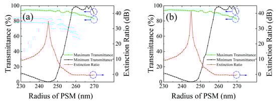 Transmittance and extinction ratio with the variety of PSM radius for PCM rotation angles of 45° (a) and 135° (b).