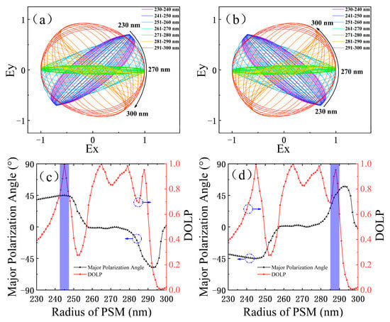 Figure 6a,b are polarization ellipses as a function of the PSM radius. The relationships between the major polarization angle and DOLP at the PCM rotation angles of 45° and 135° are shown in Figure 6c,d, respectively. It can be seen that when the PCM rotation angle is 45° (Figure 6c) and 135° (Figure 6d), the main polarization angle of the linear polarizer changes from 45° to −45° and from −45° to 45° as the PSM radius increases. For the combination of PSM and PCM, the major polarization angle of the outgoing light can be adjusted from 45° to −45° with quite small steps less than 1°, which can bring high precision polarization modulation to the incident light. In addition, when the PCM rotation angle is 45° (135°) and the PSM radius is 245 nm (288 nm), the major polarization angle is 45.02° (46.14°) and the degree of linear polarization is 0.9933 (0.9942). In this situation, the polarization effects are almost the same for both PCM rotation angles of 45° and 135°. From the above phenomenon, it can be concluded that the polarization effect of the polarizer can also be modulated by the changing radius of the PSM.