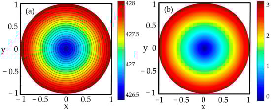 According to Fourier’s law of heat conduction, heat will move from a high temperature region to a low temperature region when there is non-uniform temperature distribution. Equation (5) indicates that the temperature of the cell is directly proportional to the atomic density of alkali metal vapor. The electric heating plate is in close contact with the cell while it is being charged and heated. The lack of internal heating in the cell results in a slight gradient of temperature along its radius. Thus, the external wall of the cell with a radius of 10 mm can be simulated as being in a state of thermal equilibrium. In the transient case of 428 K, the cell is simulated in two dimensions. In the two-dimensional case, the temperature distribution in the cell is approximated by the two-dimensional Gaussian distribution model shown in