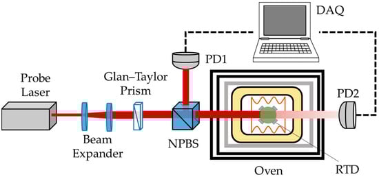 15]. Therefore, the AAS temperature measurement method is beneficial for measuring the temperature inside the cell. RTDs have high measurement accuracy and stable performance, which is suitable for measuring temperature signals. Therefore, RTD-based temperature measurement is also suitable for measuring the temperature of cells. However, both temperature measurement methods have technical drawbacks that are hard to avoid. Measurements using RTDs require additional calculations to obtain the temperature at the center of the cell. Hence, temperature measurements using this method are inaccurate. AAS temperature measurement utilizes fitting absorption spectra, but measurement becomes challenging when the vapor density is high. This is because directly measuring the extremely weak transmitted light near resonance is difficult. Moreover, severe attenuation of light within the resonance linewidth makes it hard to determine the absorption line shape, which makes it impossible to measure through far detuned measurement [