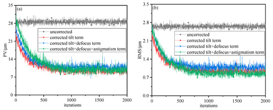 - Wu, J.L.; Ke, X.Z.; Yang, Y.Q.; Liang, J.Y.; Liu, M.Y. Correction of Distorted Wavefront Using Dual Liquid Crystal Spatial Light Modulators. Photonics 2022, 9, 426. [Google Scholar] [CrossRef]
