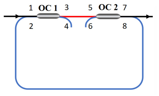 Next, we simplified the model of the DR-PS, which can be reduced to a double-OC nested fiber ring model, as shown in Figure 3. We derive the transfer function of the fiber ring model and simulate its filtering characteristics in detail.