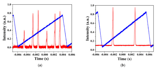 Figure 5. Longitudinal mode oscillation measured by F-P interferometer. (a) Multi-longitudinal mode oscillation without DR-PS; (b) Stable single-longitudinal mode operation.