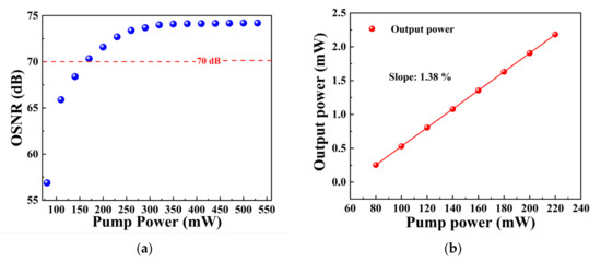 Figure 7. (a) Variation of OSNR with pump power. (b) Laser output power vs. pump power.