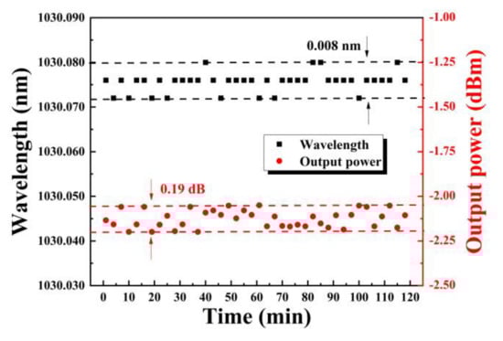 In addition, we tested the long-term stability of the laser output through the OSA, and monitored the output center wavelength and power stability of the single-frequency laser while keeping the pump power constant at 250 mW. As shown in Figure 8, the data acquisition is performed every 2 min over a time range of 120 min. The fluctuation range of the output wavelength and power of the laser is in the range of 0.008 nm and 0.19 dB within 120 min, indicating that the built laser has good long-term stability. This fluctuation is mainly due to small fluctuations caused by the experimental environmental conditions.