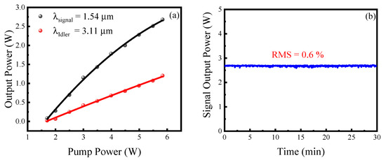 Figure 3a shows the variation in signal and idler output power versus the pump power. The pump threshold of the MgO: PPLN OPO is about 1.7 W. Considering that the silicon filter lens has only 95% transmittance in the idler tuning range and the actual effective pump laser power on MgO: PPLN crystal is only 5.85 W, the pump–to–signal power conversion is 45.8% and pump–to–idler power conversion is 21.6%, corresponding to a total conversion efficiency of 67.4%. We recorded the power stability of the signal radiation centered at 1540 nm for half an hour. The result is shown in
