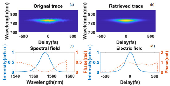 Figure 5a,b is the original recorded and retrieved traces, respectively. Using an inverse algorithm, we obtained the spectrum and temporal pulse as shown in