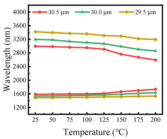 Figure 7, the signal has a red shift with the increase in temperature, and the whole wavelength range is 1.48–1.73 μm. Correspondingly, the idler tunable range is 2.54–3.38 μm.