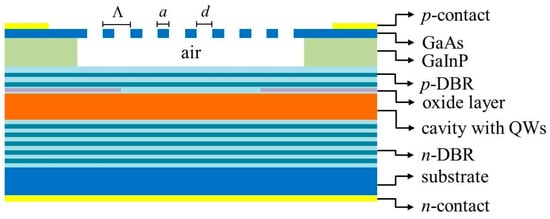- Zhang, J.; Ma, X.; Zhou, X.; Liu, A.; Zheng, W. Mode engineering of semiconductor lasers with vertical periodic layered structures. J. Phys. D. 2021, 55, 065102. [Google Scholar] [CrossRef]