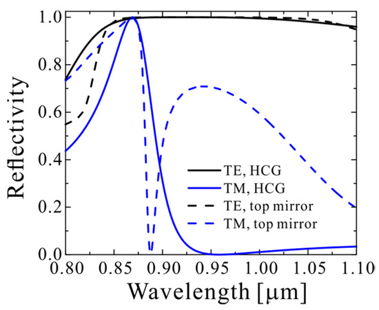 - Inoue, S.; Kashino, J.; Matsutani, A.; Ohtsuki, H.; Miyashita, T.; Koyama, F. Highly angular dependent high-contrast grating mirror and its application for transverse-mode control of VCSELs. Jpn. J. Appl. Phys. 2014, 53, 090306. [Google Scholar] [CrossRef]