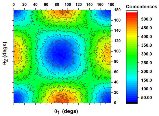 Contour map employed to infer sensor’s best operative range. Coincidence counts are mapped as function of polarisation angle of each polariser with respect to horizontal axes, namely , .