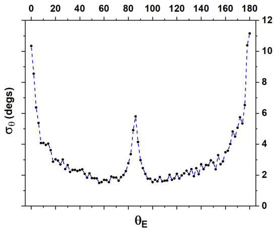 The statistical error on the estimated parameter, evaluated using Equation (2), is presented in Figure 4 as a function of the actual angles reproduced with the rotational mount ().