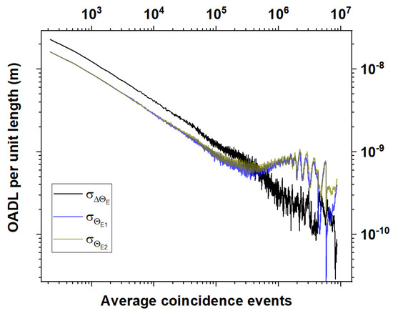 OADL per unit length as a function of the average coincidence events (black curve). The Allan deviation of the single is also reported for comparison, respecting the same legend as in Figure 5.