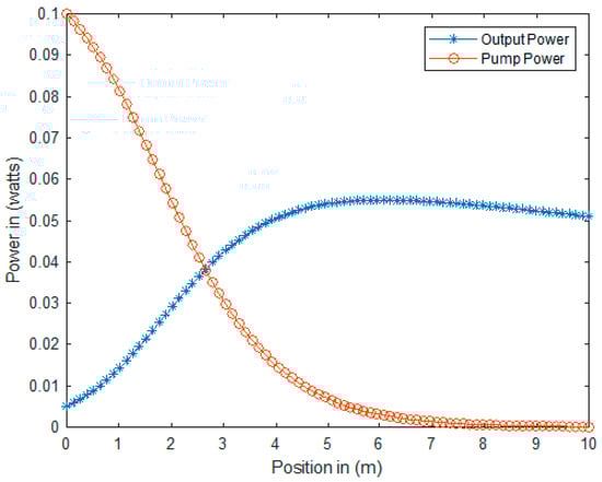 The graph in Figure 1 shows the optical power distribution inside the erbium-doped fiber gain medium that makes up the cavity as a function of position in meters. The pump source of 980 nm was coupled into the gain medium through the wavelength division multiplexer. As it propagated through the gain medium, the pump decayed exponentially, as seen on the red plot with circles in Figure 1 from left to right, resulting from strong pump saturation. As shown in Figure 1, for a pump power of 100 mW and a coupling coefficient of 10%, using a doped fiber length of 10 m, 60% of the pump power was absorbed in the first 3 m of the doped fiber [40]. The pump power absorbed created stimulated emission, which corresponded with a rapid increase in laser output power, as shown in the blue plot with asterisks in Figure 1. Figure 1 shows the graphic representation of the pump and signal powers propagating in the optical cavity, as shown in Equations (1) and (2).