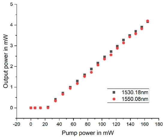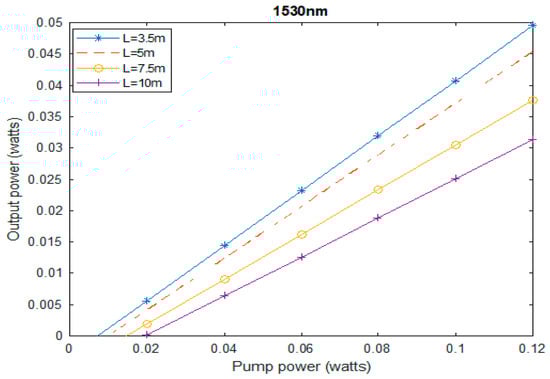 The optimal slope efficiency and output power, which were obtained for a fiber length of 3.5 m, are represented in Figure 2 and Figure 3. In other words, the maximum output power for a given pump power was obtained for a doped fiber length of 3.5 m. The output power for both 1550 nm and 1530 nm showed similar results.