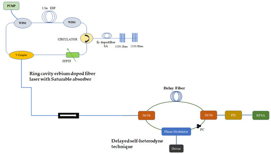 The configuration shown in Figure 4 was used to measure the linewidth of the fiber laser before and after introducing the saturable absorber into the fiber laser. The delayed self-heterodyne technique was practically used for the linewidth measurement. The delayed self-heterodyne technique was implemented by tuning the fiber laser output wavelength between 1530.18 nm and 1550.08 nm per time. This was achieved using the tunable filter and adjusting the applied bias voltage on the tunable filter. The self-heterodyne technique used a delayed line Mach–Zehnder interferometer, which comprised of two 50/50 three-port optical couplers, a phase modulator, a polarization controller (PC), and a photodetector, as shown in [41,42]. The output of the fiber laser was used as the input of the interferometer used for the linewidth measurement. The 50/50 coupler split the input of the interferometer into two spectrums of the same amplitude, traveling to different parts. A part of the spectrum traveled through a delayed line of 30 km such that the resolution of the self-delayed heterodyne configuration was 6.6 kHz, corresponding to the (30 km) delayed line. The resolution limit, or free spectral range (FSR), of the delayed line interferometer was obtained using the expression in Equation (4) below.