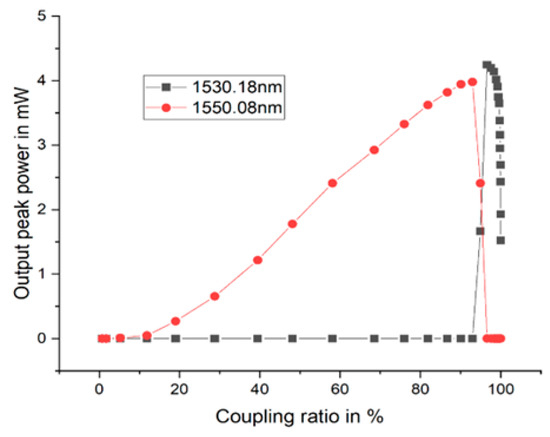 To obtain the optimal coupling ratio at which the output power in both transmitting wavelengths was balanced, we characterized the fiber laser by adjusting the knob on the variable coupler the output power obtained is represented in Figure 6 and measured using an optical spectrum analyzer. The output spectrum from the fiber laser was measured using an optical spectrum analyzer AQ6370D from Yokogawa Test and Measurement Corporations. The maximum input power of the optical spectrum analyzer was 20 dBm, so we designed our laser such that our maximum output power did not saturate the photodetector of the spectrum analyzer. The optical spectrum analyzer was set to a span of 80 nm, a resolution of 0.5 nm, and a ref level of 10 dB/div. The optimization of the coupling ratio was to balance the optical output power for the two wavelengths reflected from 1530.8 nm and 1550.08 nm, respectively. The optimization of the coupling ratio was performed without the tunable filter or the saturable absorber in the configuration. Using a pump power of 100 mW, a balanced output power of 3.4 mW was obtained for wavelength 1530.18 nm, and 3.1 mW was obtained for 1550.08 nm, respectively. The balanced output power was obtained at a coupling ratio of 95% and an optical signal-to-noise ratio (OSNR) of 61 dB for the laser output spectrum for each wavelength, as shown in Figure 5.