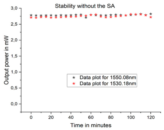 The saturable absorber was added to the fiber laser configuration, as shown in Figure 4. The stability of the output power was measured, and the result showed no visible fluctuation in the amplitude of the output power for both wavelengths measured with an optical spectrum analyzer. The length of the erbium-doped fiber used as the saturable absorber was 0.5 m. Since our focus was mainly to achieve a more stable output power and a narrow linewidth, we did not optimize the saturable absorber.