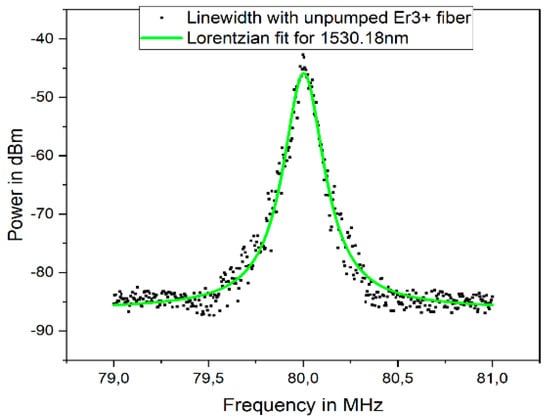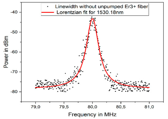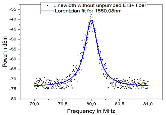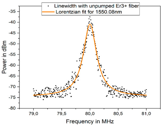 The linewidth of the second wavelength of 1550.08 nm was measured next, and the plot is presented in Figure 10. As indicated in Figure 10, a FWHM occurred at 1550.08 nm, which showed a linewidth of 28.3 kHz at 1550.08 nm.