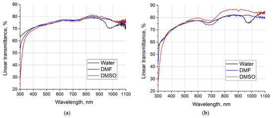 To prepare liquid media, 0.01 wt% of (OH)4PcHH @ SWCNT powder was added to 50 mL of the following solvents: water, DMF, and DMSO. Then, the resulting suspensions were processed in a Soniqator Q700 ultrasonic homogenizer (Qsonica, Newtown, CT, USA) at 30 W and 40% amplitude for 1 h to achieve dispersion uniformity. The temperature of the dispersions during ultrasonic homogenization was controlled and did not exceed 40 °C. Centrifugation at 1000 rpm was performed for 10 min to remove large unmixed agglomerates.