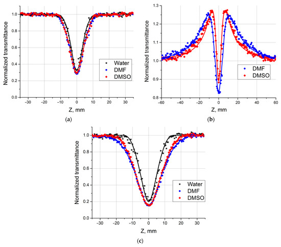 To study the nonlinear optical response, open-aperture Z-scan and the experiment with fixed sample position were performed. The studies were carried out in the range from −35 to 35 mm relative to the focus of the lens. Figure 5 shows the Z-scan curves of pure SWCNTs, (OH)4PcHH, and (OH)4PcHH @ SWCNT composites in water, DMF, and DMSO. Since phthalocyanines are insoluble in water, results are shown for DMF and DMSO solutions. The solid lines on the charts show theoretical fits, which were obtained by the processing of the experimental data with the “threshold” model [46]. The threshold model provides the plotting of theoretical curves for various optical coefficients and comparison with experimental data. Such processing based on radiation transfer equation allows calculating nonlinear optical parameters such as third-order nonlinear absorption coefficient and limiting threshold. The last parameter is especially important in the study of materials with a pronounced nonlinear threshold effect. The Z-scan results for (OH)4PcHH solutions were analyzed with a nonlinear absorption model that considers saturable absorption [47].