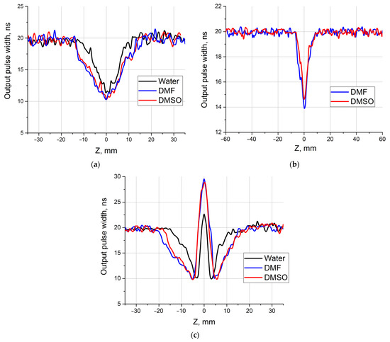 A different trend was observed for dispersions of (OH)4PcHH @ SWCNT composite. The output pulse width was reduced to ~10 ns for the studied samples. Then, immediately near the focus, the pulse width sharply increased and reached values of 22.5, 28, and 29 ns for water, DMF, and DMSO dispersions, respectively. The comparison of Figure 5 and Figure 6 shows that the transition to an increase in the pulse duration occurs when the normalized transmission reaches the value of ~0.3.