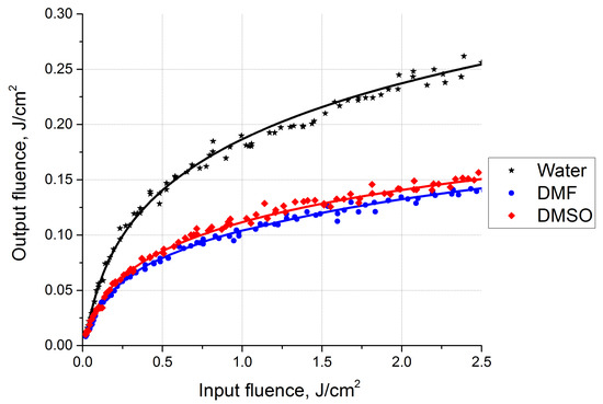 Additionally, input-output curves were obtained during the fixed sample position experiment for (OH)4PcHH @ SWCNT composites in different solvents. For this purpose, the samples were placed at the focus of the lens, with the input laser pulse fluence being varied in the range of 0–2.5 J/cm2. The beam radius at the lens focus was ~75 μm. The results are presented in Figure 7. Similarly to the Z-scan, the water dispersion of (OH)4PcHH @ SWCNT composites exhibited the worst nonlinear optical limiting. The DMF and DMSO dispersions showed almost identical limiting properties, which are in good agreement with the Z-scan data.