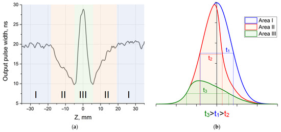 The effect of changing the pulse width can also be explained in terms of the reverse saturable absorption [53]. The output pulse width curve can be divided into three regions (Figure 8a). In area I, the output pulse has a Gaussian temporal profile (Figure 8b). This area is characterized by a linear interaction of the laser pulse with the medium. The pulse fluence is not enough to induce nonlinear absorption. When approaching the focus, a transition to a nonlinear interaction occurs. The leading edge of the beam saturates the medium, interacting with it linearly. The trailing edge of the beam already passes through a saturated medium and thus experiences nonlinear absorption (area II). Near the focus (±4 mm from the focus), the intensity becomes high enough for the leading edge of the pulse to experience nonlinear absorption (area III). This leads to a sharp drop in the peak intensity of the pulse.