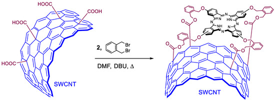 Next, phthalocyanine 2 (25 mg) was added to a suspension of SWCNT-COOH (50 mg) in DMF (50 mL), and the mixture was subjected to ultrasonic treatment for 30 min (Scheme 2). After that, bis-1,2-(bromomethyl)benzene (10 mg) and 1,8-Diazabicyclo(5.4.0)undec-7-ene (DBU) (0.1 mL) were added. The mixture was boiled for 30 min, after which the solid mass was centrifuged and washed many times in tetrahydrofuran (THF) to remove unreacted 2 and oligomeric phthalocyanine products. The weight of the material increased by 21 mg after synthesis, from which it can be concluded that the reaction was complete and by-products were formed in insignificant amounts. According to dynamic light scattering (DLS) data, the hydrodynamic radius increased from 288 ± 55 nm to 350 ± 60 nm after the reaction.