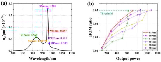 - Wan, Y.; Xi, X.; Yang, B.; Zhang, H.; Wang, X. Enhancement of TMI Threshold in Yb-Doped Fiber Laser by Optimizing Pump Wavelength. IEEE Photonics Tech. Lett. 2021, 33, 656–659. [Google Scholar] [CrossRef]