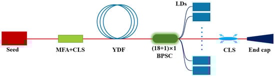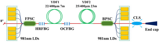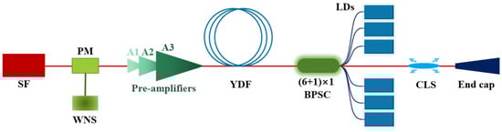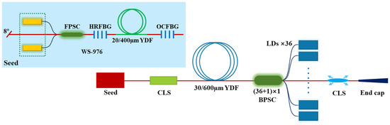 - Wu, H.; Song, J.; Ma, P.; Liu, W.; Ren, S.; Wang, G.; Li, R.; Xiao, H.; Huang, L.; Leng, J.; et al. Bidirectional tandem-pumped high-brightness 6 kW level narrow-linewidth confined-doped fiber amplifier exploiting the side-coupled technique. Opt. Express 2022, 30, 21338–21348. [Google Scholar] [CrossRef]