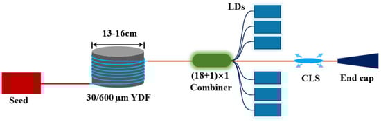 - Wu, H.; Li, R.; Xiao, H.; Huang, L.; Yang, H.; Pan, Z.; Leng, J.; Zhou, P. High-power tandem-pumped fiber amplifier with beam quality maintenance enabled by the confined-doped fiber. Opt. Express 2021, 29, 31337. [Google Scholar] [CrossRef] [PubMed]