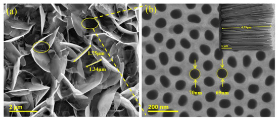 Figure 2b shows the surface morphology of the NpAA membrane. It can be seen that a large number of regular circular pores were closely arranged in the form of hexagonal cells, parallel to each other and perpendicular to the bottom (as shown in the insert). The sample was prepared with about 2 h for the secondary anodic oxidation and 1.5 h for pore expansion, the average diameter, and depth of the nanopores were about 70 nm and 4.5 μm, respectively.