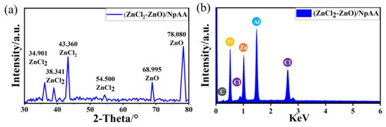 Elemental composition of (ZnCl2-ZnO)/NpAA film. (a) X-ray diffraction pattern, (b) energy dispersive X-ray spectra.
