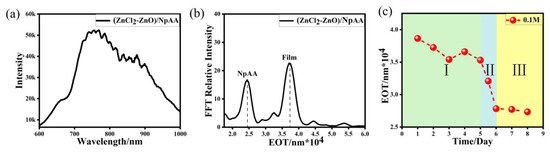 The production process of ZnCl2-ZnO nanosheets growing on the NpAA substrate with 0.1 M precursor ZnCl2 solution and forming a composite film, which was investigated by RifS technology was shown in Figure 4. During experiments, the interference spectrum at a certain moment was recorded non-destructively by the RIfS system (Figure 4a); and then, the corresponding EOT value was calculated through FFT (Figure 4b), there were two peaks because the (ZnCl2-ZnO)/NpAA film was composed of two layers; subsequently, sorting and grouping the EOT values monitored at different moments, the characteristic curves of EOT values over time for the entire composite film (Figure 4c) was accomplished.