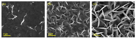 Comparing EOT − t characteristic curves as shown in Figure 4c and Figure 6, it is obvious that the higher the concentration of ZnCl2 precursor, the longer the duration required to completely synthesize the nanocomposite film (i.e., the time for the end of stage II and the beginning of stage III). The main reason for this phenomenon may be that the higher the concentration of precursor solution, the larger the size of the ZnCl2-ZnO nanosheet formed (shown in Figure 7).