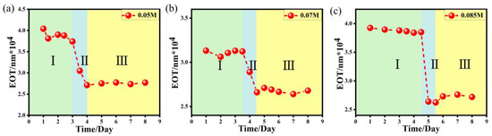 Figure 6 shows the EOT − t characteristic curves of composite films synthesized from ZnCl2 precursor solution of different concentrations such as 0.05 M, 0.07 M, and 0.085 M. From Figure 6a–c, it can be clearly found that the variation EOT − t curves were all the same as the changing trend of the 0.1 M precursor solution curves as shown in Figure 4c; that is, there were three distinct stages as follows: stage I, EOT value fluctuates around a constant and overall has a downward trend over a period of time; stage II, EOT value drops to a relatively small value; stage III, EOT value has stabilized without obvious change. However, after careful analysis, it can be easily discovered that there were obvious differences between the characteristic EOT − t curves of different precursor concentrations. For example, the moment at which the fast decrease begins (i.e., the starting moment of stage II) was different when the concentration of the precursor solution was different. When the precursor concentration was 0.05 M, the curve entered stage II after 3 days (Figure 6a), while the starting time was about 3.5 days (Figure 6b) and 4.5 days (Figure 6c) as the precursor concentrations were 0.07 M and 0.085 M, respectively. Additionally, on the 5th day, the precursor concentration was 0.1 M (Figure 4c). It is thus clear that the higher the concentration of precursor ZnCl2, the longer the duration of stage I, i.e., the later the beginning time of stage II.