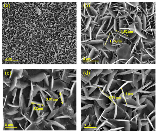 Figure 7 is the (ZnCl2-ZnO)/NpAA composite films prepared with various concentrations of ZnCl2 precursor solutions, such as 0.03 M, 0.05 M, 0.07 M, and 0.1 M. All samples were detected after about 7 days of preparation. As shown in Figure 7a, it is the SEM image of the (ZnCl2-ZnO)/NpAA composite film produced with a precursor concentration of 0.03 M. It can be clearly observed that there were sparse nanosheet-like structures on the top surface of NpAA substrate, most sheet-like structures were not completely formed. Figure 7b–d are nanosheets synthesized with precursor concentrations of 0.05 M, 0.07 M, and 0.1 M, respectively. These nanosheets were perfectly accomplished and perpendicular to the substrate surface, densely interlaced.