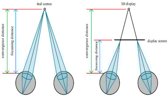 The virtual reality headset display provides the impression of immersion to the user because the image presented in the virtual reality headset display offers the users a stereoscopic impression. When using a virtual reality headset display, the focusing distance is the range between the human eyes and the monitor, and the convergence distance is the distance between the human eyes and the observed objects in the image [21,22,23,24], as shown in Figure 1.