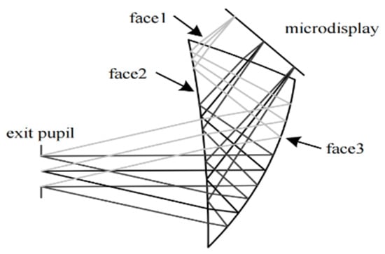 In order to minimize the number of virtual reality helmet display lenses, the researchers optimized the design of the prism with the free-form surface lens as the design idea, made the original horizontal prism surface into a free-form surface, and developed a single free-form surface. The reduction of the number of lenses not only solves the problems pertaining to the large volume and high quality of virtual reality head-mounted displays, but also reduces the production cost [38,39].