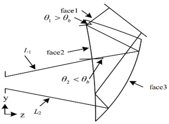 The optical part of the free-form prism HMD generally includes two parts: a free-form prism and a microdisplay. When the light reaches face 2 for the first time, the incident light reaches face 3 after total reflection, and the light reflected on face 3 strikes face 2 again. The incident light does not undergo total reflection this time and enters the human eye through face 2. The schematic diagram of an HMD optical system is shown in Figure 5, and Figure 6 presents the schematic diagram of a free-form surface prism that satisfies the condition of total reflection.