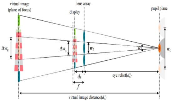 For the design of a microlens array structure applicable to a virtual reality headset display, multiple small magnifying lenses are actually inserted between the pupil of the human eye and the microdisplay to magnify the image of the microdisplay [45,46]. The relationship between the microdisplay, the microlens array, and the pupil of the human eye is shown in Figure 8.