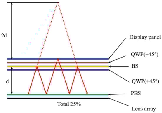First, the microdisplay emits linearly polarized light, which changes state of polarization to the initial linearly polarized light and is reflected by the PBS as the light passes through the QWP, BS, and another orthogonal polarizer to the QWP. Afterwards, the light is reflected by the BS and the light is incident on the PBS again. At the same time, the light passes through the single QWP twice and becomes orthogonally linearly polarized light. At this point, it passes through the PBS and propagates towards the lens array. Since the light from the panel is repeatedly propagated three times between the BS surface and the PBS surface, the light is optically equivalent to light from a much greater distance, twice the distance between them, and since the QWP is incredibly thin and the PBS and BS are closely connected to the microdisplay and lens array, we can obtain an effective light range three times longer than the physical system distance between the microdisplay and the lens array. As a result, the system distance required for a virtual reality headset display designed by using the Pancake structure can be reduced to 1/3 of the required optical system distance [53]. However, such a design also has its drawbacks, as the Pancake system suffers from a shortfall in optical efficiency, with 50% of the light lost during both reflection and propagation of the BS, resulting in a theoretical total optical efficiency of only 25% [54,55]. Therefore, when a virtual reality headset display uses Pancake, the overall light intensity of the microdisplay must be enhanced so that the user does not have a bad experience with the virtual reality headset display with the Pancake system because of low light efficiency.