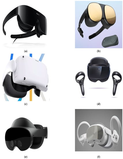 Product prototype (a) Huawei VR Glass; (b) HTC ViveFlow; (c) Arpara AIO 5K; (d) YVR2; (e) Meta Quest Pro; (f) Pico 4 Pro.