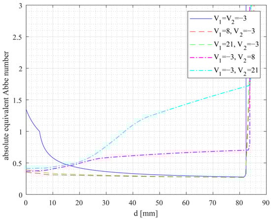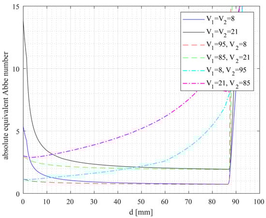 Paraxially calculated absolute equivalent Abbe numbers for purely refractive doublets as a function of lens distance.