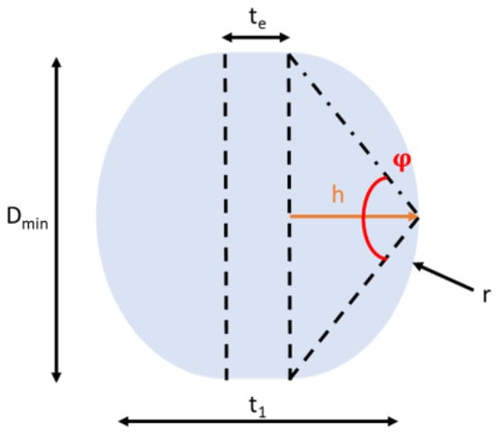 The minimum radius of such a lens with a fixed lens thickness can be achieved if the lens diameter and the edge thickness are as small as possible. Geometric conditions, such as the minimum lens diameter of 5 mm and the minimum edge thickness of 1 mm, have been defined, taking into account the manufacturing limits of standard lenses [26]. Figure 6 shows a biconvex lens with the values needed to describe its shape.