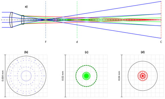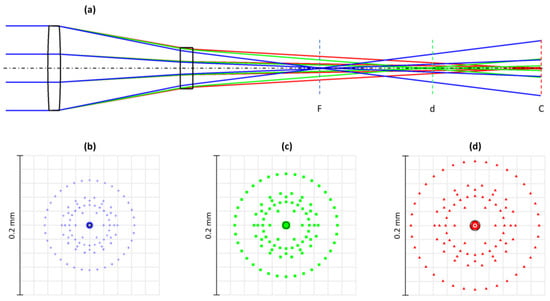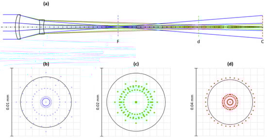 Although the system in Figure 9 does not appear to be suitable for a hyperchromatic implementation, the results in Table 5 show that diffractive and hybrid systems in principle have a high potential to achieve much lower equivalent Abbe numbers. For diffraction-limited imaging qualities, the results of the numerical calculations for the initial systems were again optimized by the optical design software. The following tuning procedure assumes similar boundary conditions and aberrations as before. For the treatment of the diffractive structure in the simulation software, the surface type “binary 2” with a normalization radius of 100 mm and a quadratic phase term (p2 value) was specified [28], and the beam formation was assumed with first-order diffraction. The results of the optimization process are shown in Table 6. Exemplarily, the color separation achieved for configuration 1 can be seen as a ray trace in Figure 10a, and the high image quality of the optimized system is shown in Figure 10b–d as the corresponding spot diagrams.