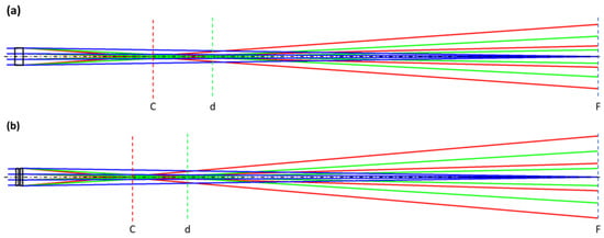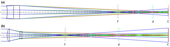 These image distances were calculated for the short reference wavelength ( = 486.13 nm) and for the long reference wavelength ( = 656.27 nm) of the optical system at an object distance of infinity [15]. In addition, the calculations in Formulas (4) and (5) use the total focal length of the system and the focal length of the first lens at the corresponding wavelength.