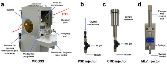 All injector systems developed at the PAL-XFEL can be installed and operated in a multifarious injection chamber for molecular structure study (MICOSS) (Figure 1a) []. The MICOSS system consists of three-axes translation stages to align the injection stream to the X-ray beam path, as well as two in-line camera systems to monitor the two-dimensional positions of the liquid stream, parallel and perpendicular to the incident XFEL pulses. The inner space of the MICOSS is isolated from the outside of the chamber to maintain a low vacuum or helium purging environment; therefore, the injection stream is not affected by the external air flow in the experimental hutch []. To date, three different injection methods have been applied to SFX instruments at PAL-XFEL: (i) particle solution delivery (PSD) injectors [], (ii) carrier matrix delivery (CMD) injectors [], and (iii) microliter volume (MLV) syringe injectors [].